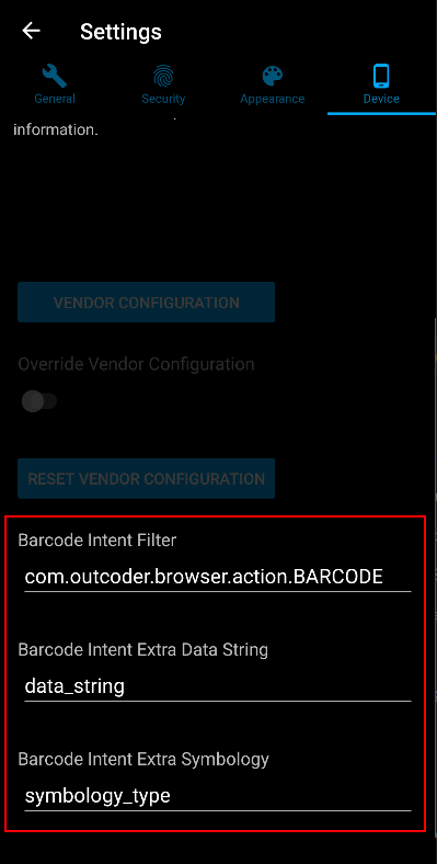 The Extra Data String setting must also match that used by the device’s built-in barcode intent settings.